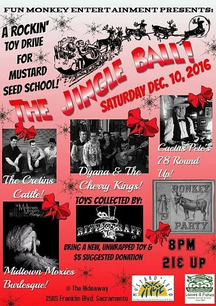 A special line up of regional talent is gathering to make a memorable night of fun and entertainment. You can look forward to records with Sacramento favorite, Cactus Pete, special holiday themed burlesque performances by Midtown Moxies, and amazing live music with Dyana and the Cherry Kings, The Cretins Cattle and Donkey Party!