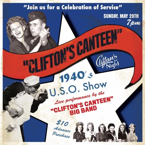 Celebrate Memorial Day weekend by honoring the men and women of service as CAC Studios joins Clifton’s for a full scale U.S.O. star studded bash! Punch up your dance card while dancing with the stars and fill up on drinks with your ration card while you enjoy the show! Flash back to an era gone by when the Andrew Sisters, Judy Garland, Marilyn Monroe and the stars of the 40s entertain the troops with standards that you know and love all played by a jazz hot band! This is a one time event that you won’t want to miss, you brush off your 40s fashion and come celebrate in style!