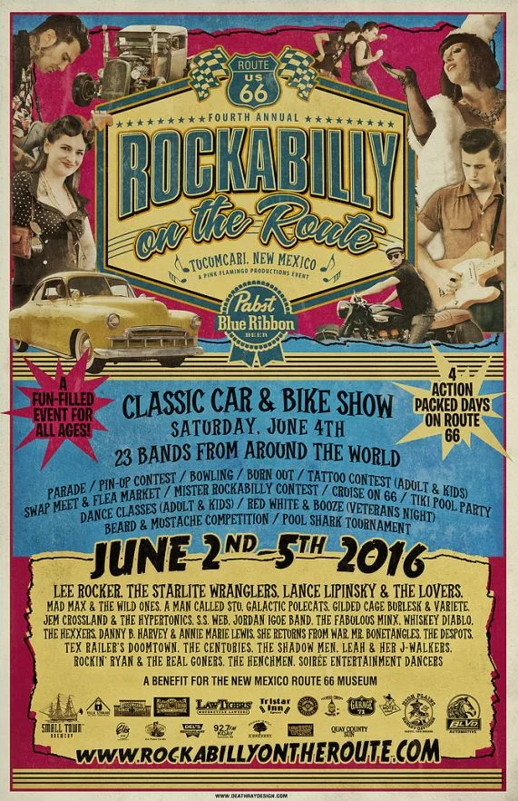 Including Thursday, Friday & Saturday Headliner Shows at Tucumcari Convention Center, over 23 rockabilly/americana bands from around the world including Lee Rocker, The Starlite Wranglers (Japan), Lance Lipinsky & The Lovers, Mad Max and the Wild Ones, a classic car/bike show, old school burn-out, the midnight madness shows at the Tristar Inn Xpress, An Original Route 66 Business, Veteran's Night at the Delfido Gonzales - VFW Post 2528, the burlesque extravaganza show, tattoo contest (adult & kids!), a pool tournament, beard and mustache competition, dance classes, bowling, the happy hour hootennany's, a cruise on 66, a pop-up drive-in, a parade, flea market, swap meet, a tiki pool party and more!
