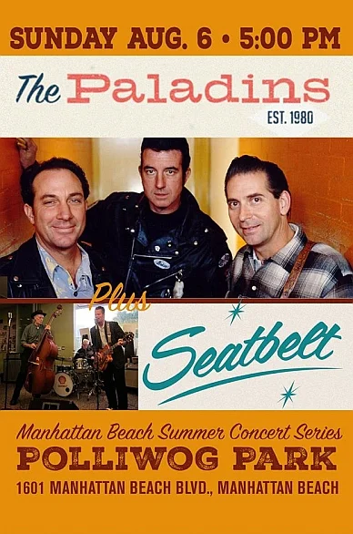Details: All ages, free concert, gather family and friends, pack a picnic and enjoy live entertainment from the legendary Paladins plus guests Seatbelt in Manhattan Beach, California.