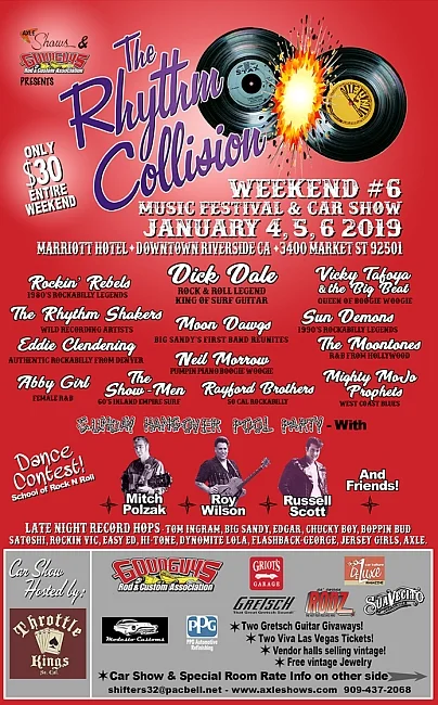 Details: All ages, Under 21 must be accompanied by an adult. Only $30 for the entire weekend (NO PRE-SALE TICKETS!), Throttle Kings Car Show, special displays, special guests, multiple hall with vendors selling vintage items, dance contest, 2 Gretsch giveaways and more! Book your rooms now - *Mention The Rhtythm Collision” for special room rates (951)-784-8000. The Marriott Hotel will sell out!
